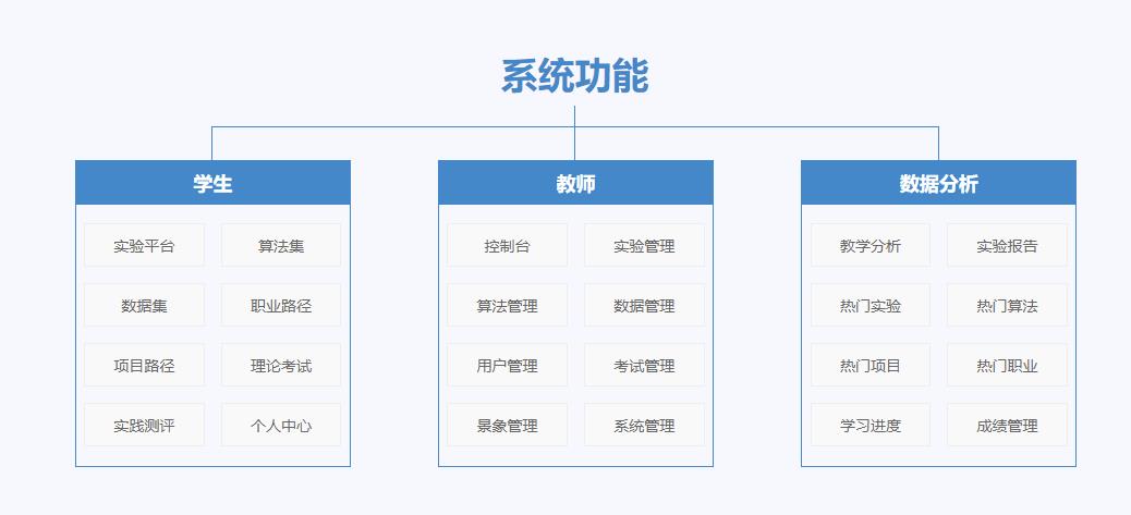 大数据实训系统(大数据实验系统)是由北美国际自主研发的一套专门用于大数据实验教学的平台,平台基于OpenStack及Docker混合云平台开发而成,系统最终部署在学校内部,私有云B/S架构,支持用户通过浏览器访问使用。系统包括的实验课程有大数据基础、大数据存储与管理、数据采集及网络爬虫、数据分析、人工智能等24门课程共计800多个实验项目。可满足本科数据科学与大数据技术专业、大数据管理与应用专业、高职大数据技术与应用专业、中职大数据应用技术方向的教学需求。系统课程学习模式包括实验平台、项目路径和职业路径。在教学管理方面,为学生提供个性化课程推荐及AI课程助手,助力学生定向就业,为高校的学生能力培养及教师的工作提供有力的支持。