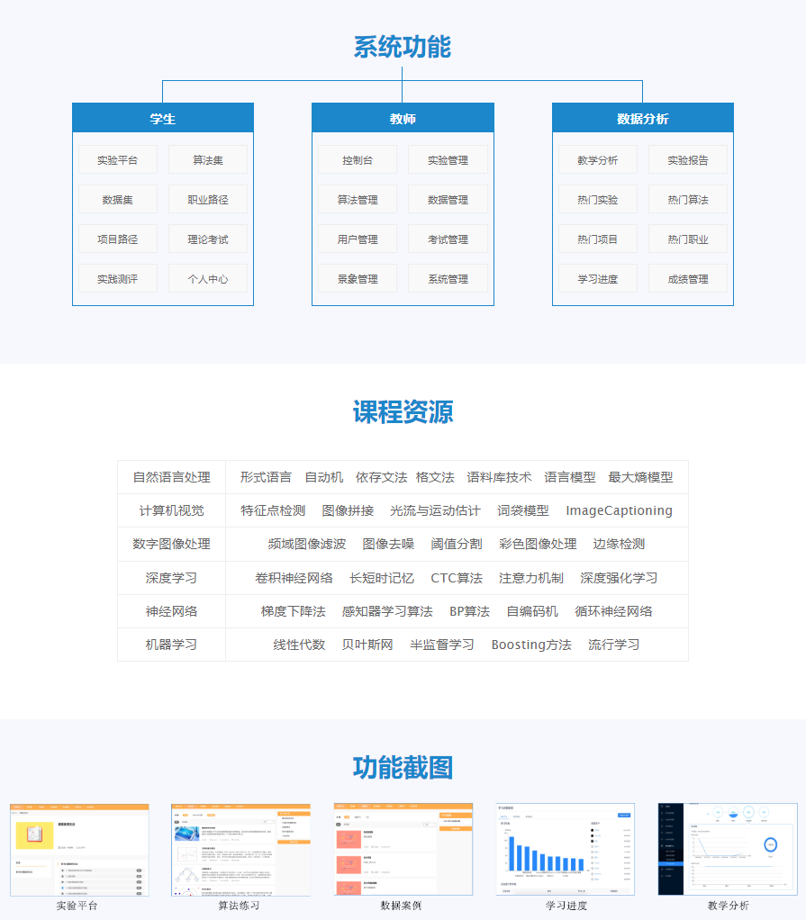 人工智能实训系统(人工智能实验系统)是由北美国际自主研发的一套专门用于人工智能实验教学的平台,平台基于OpenStack及Docker混合云平台开发而成,系统最终部署在学校内部,私有云B/S架构,支持用户通过浏览器访问使用。系统包括的实验课程有机器学习、神经网络、深度学习、数字图像处理、计算机视觉、自然语言处理等12门课程共计200多个实验项目。可满足本科人工智能专业、高职人工智能技术服务等人工智能相关专业的专业教学需求。系统课程学习模式包括实验平台、算法集和职业路径。在教学管理方面,为学生提供个性化课程推荐及AI课程助手,助力学生定向就业,为高校的学生能力培养及教师的工作提供有力的支持。