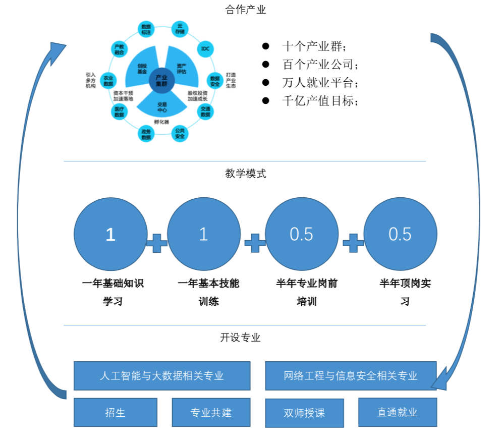 按照教育部校企“四合作”的办学原则,紧密结合本地区及其周边地区经济发展和产业升级的需要,立足于人工智能技术与应用人才需求,共同研究制定人工智能技术与应用专业人才培养目标、培养方案、课程体系等内容,充分发挥合作产业公司的人工智能技术服务、技术开发、技术指导、人才培训和技能再提高的职能,通过校企共建“人工智能产业学院”,创新办学体制机制,共同制定与之相适应的课程体系,在保质保量完成教学大纲、实训教学任务的前提下,可自主面向社会开展技能培训与鉴定工作,通过自身的滚动发展而不断壮大。力争将项目建设成一个区域资源共享、高效运作、集教学、培训、技能鉴定与技术服务于一体的,具备优良的专业教学师资队伍,良好的“职场”环境,采用现代化管理方式和手段的,具有示范性作用的人工智能产业学院,通过产业学院共建使企业深度参与到合作院校的专业建设、人才培养、课程改革、教学方法创新、实训室建设、师资建设与提升、招生宣传、实习就业、运营管理等方方面面,以快速提高人才培养质量,打造真正好招生好就业的特色品牌专业,助力于学校快速亮出品牌、亮出特色。